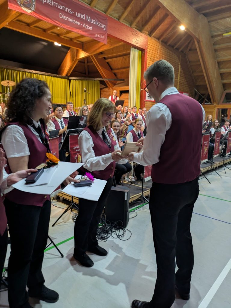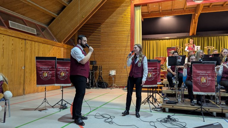 Ein besonderes Highlight des Abends war das Gesangsstück mit Louisa Pohlmann und Dominik von Künßberg, das vielen Gänsehautmomente bescherte und für standing ovations sorgte. Zwischen all den Klängen und Rhythmen der Knüppelmusik war auch Zeit für Dankbarkeit: Geehrt wurden drei Mitglieder unseres Vereins – Jacqueline Hanel für 15 Jahre, Iris Arnold für 40 Jahre und Christiane Hilke für stolze 50 Jahre aktives musizieren. Ohne Menschen wie sie wäre unser Verein nicht das, was er heute ist.